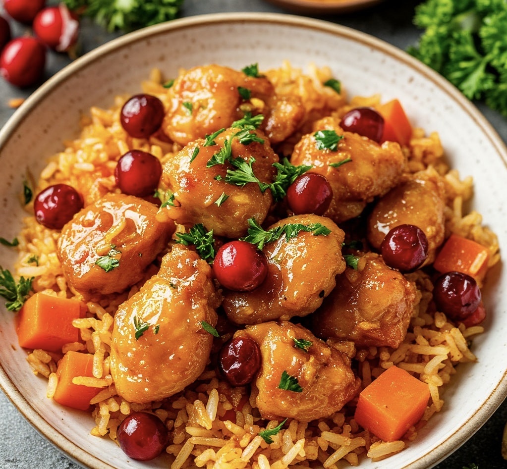 Этот рецепт сочетает нежный рис, сочную курицу и пикантную клюкву — получается гармонично, вкусно и очень аппетитно. Идеален для семейного ужина или небольшого застолья. Время приготовления: 40 мин