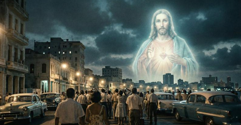 Представьте себе картину: глухая ночь в Гаване 1962 года. Жители прогуливаются по набережной Малекон, как вдруг низкие облака над Карибским морем озаряются сверхъестественным сиянием. В небе вырисовывается гигантская фигура. Это Иисус Христос. И он говорит. Его послание ясно и громогласно: Фидель Кастро — антихрист, и кубинскому народу надлежит его свергнуть.