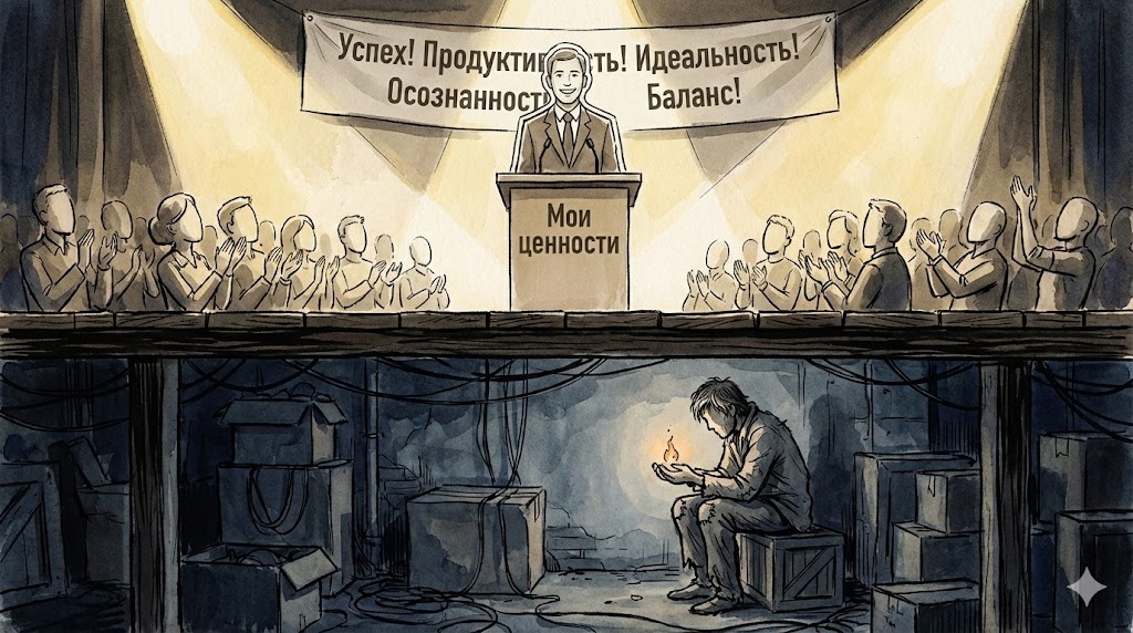 Клиент с тревогой и перфекционизмом на вопрос «Что для вас важно?» выдаёт пресс-релиз: «Саморазвитие, семья, здоровье, честность, баланс, вклад в мир». А потом мы открываем его дневник активности и видим: 80-часовая рабочая неделя, сон 4 часа, «отдых» в виде залипания в новостях и последний разговор с детьми в формате крика на бегу.