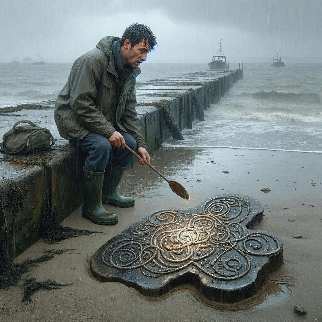 Автор Роман Калугин Марк верил в клады. Верил так сильно, что потратил последние деньги на металлоискатель «Garrett ACE200», в простонародье "Аська" с функцией discrimination, чтобы не копать каждый ржавый гвоздь. Три месяца он обшаривал пляжи, находя лишь монетки-пустышки и бесконечные пробки от бутылок. Заброшенный дом на окраине города тоже оказался щедр только на осколки и старую проводку. Удача пришла в пасмурный четверг, когда Марк решил проверить старый причал, давно покинутый рыбаками. Шел мелкий дождь, море было свинцовым. «Аська» пискнула привычно и скупо пару раз, но возле самой кромки воды, где бетонная плита откололась, раздался пронзительный, многотональный звук — такой, какой бывает только от крупного металлического предмета. Сердце заколотилось. Марк снял рюкзак, достал совок и начал копать. В мокром песке под плитой что-то блеснуло. Не золото и не серебро. Это была странная, почти круглая металлическая пластина размером с ладонь, покрытая сложным узором из спиралей