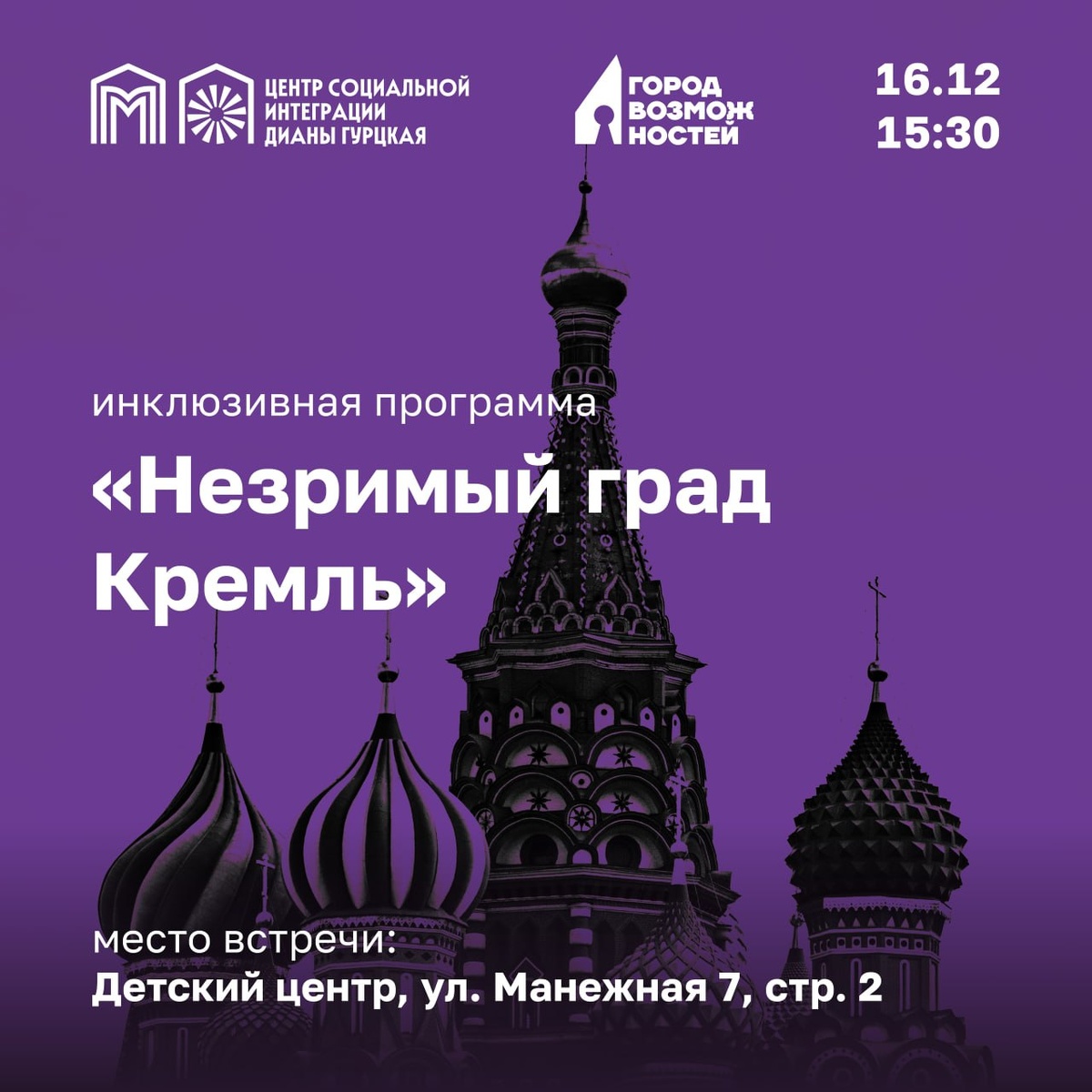 ⭐️ Кремль открывает свои тайны Центр социальной интеграции Дианы Гурцкая представит специальную программу для незрячих и слабовидящих детей, их семей, а также ребят с ментальными особенностями в рамках проекта «Город возможностей». Участники отправятся в путешествие по Патриаршему дворцу и Соборной площади Кремля и с помощью тактильного альбома смогут «почувствовать» архитектуру и атмосферу прошлого. Во второй части программы в Детском центре Кремля дети создадут собственный изразец — яркий творческий сувенир на память. Дата: 16 декабря 2025 Время: 15:30 (продолжительность 1,5 часа) Место встречи: Детский центр Музеев Московского Кремля, Манежная ул., 7, стр. 2 Для участия необходима регистрация по ссылке.