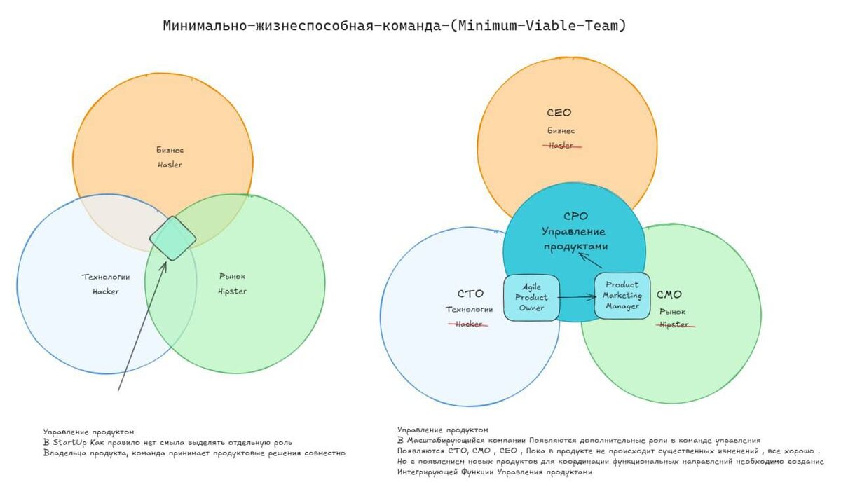 Важное уточнение про роли Hipster / Hacker / Hustler. В комментариях к этому посту 👉 https://dzen.ru/media/id/5dd465c4e5f20d1efbfebba3/v-proshlom-poste-ia-sprosil-vas-kakuiu-rol-vy-berete-na-sebia-v-produkte-693839aaf2a7c446e9024ed3 идут бурные обсуждения. “Непонятно только, почему agile PO это хакер. На моём опыте продакты (и PO, и PM) в 90% кроме документов руками ничего не делали.” Коротко: потому что - это два контура ответственности. Поясняю на схеме 👆 ) CTO, CMO, CEO Agile Product Owner стыкует команду разработки с тем, что нужно сделать — это и есть Hacker-контур (работа С технологиями, а не выполнение их). Частый Путь CPO это работа с Тех командой / TechProductOwner -> Интеграция решения и каналов - Масштабирование решения -> CPO~ Директор продукта