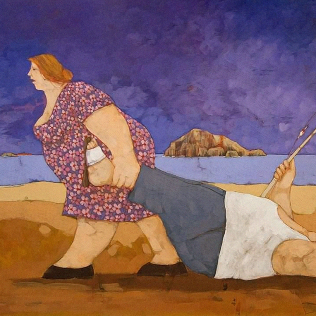 Хорошо порыбачил мужичок, душевно. Ему весело, он и сейчас удочку из рук не выпускает. А то, что ноги сами не идут,– это пустяк. На то и жена есть. Вот и волочет крепкая женщина своего бестолкового мужа, все равно любит его – такой уж достался. А пейзаж прекрасный, и цвет неба и моря перекликается с цветом платья синьоры.