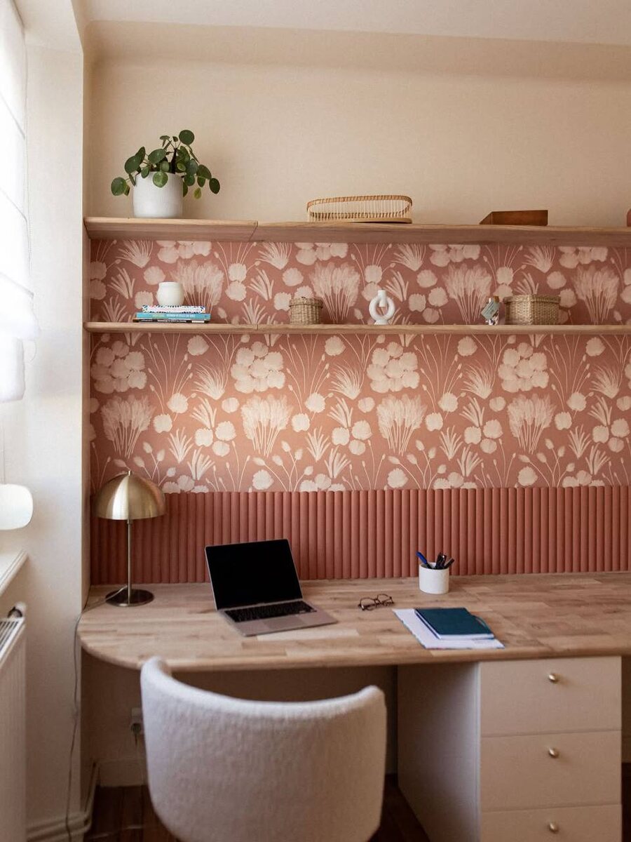 Как создать рабочее место, в котором не хочется отвлекаться? Тёплая палитра, мягкий свет и чёткий ритм — именно то сочетание, которое поддерживает концентрацию. Визуальный порядок создаёт стеновая панель W110: её вертикальный рельеф задаёт линию и аккуратно структурирует зону стола, не перетягивая внимание. Мягкий флоральный фон и графичная панель работают как сбалансированный дуэт — атмосфера остаётся тёплой и живой, а зона стола выглядит строго и собранно. Сохраняйте простое, но стильное решение! 🤍 #рабочийкабинет