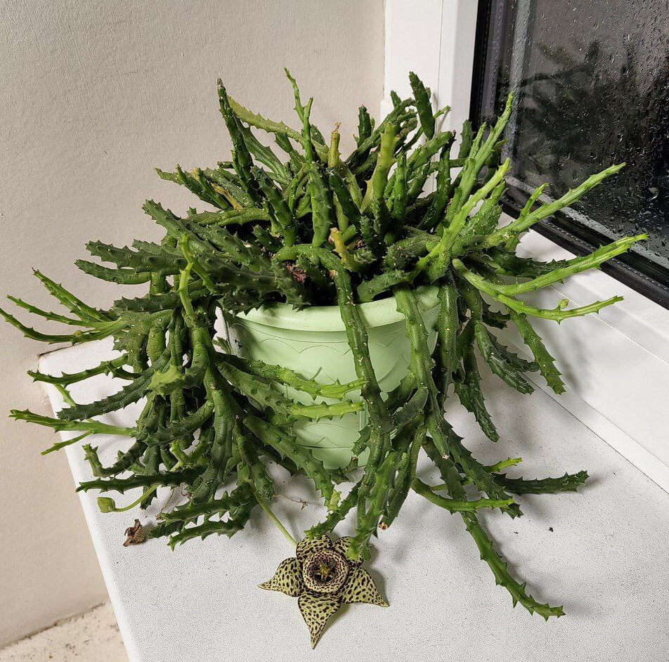 Стапелия — род суккулентных растений из семейства Кутровые 🌱 Это многолетние низкорослые суккуленты, они достигают высоты 10–60 см. Их стебли многочисленны, сочны, четырёхгранны, ветвятся у основания. По граням стеблей - большие, торчащие, неколющиеся зубцы. Цвет стеблей может быть зелёный или сизо-зелёный, а иногда с красновато-фиолетовым оттенком. Листья у них отсутствуют. Цветки одиночные или парные, размер цветка от 5 мм до 30 см (зависит от вида). Основные виды Стапелий: Стапелия гигантская. Её цветки могут достигать 30 см в диаметре, лепестки жёлто-коричневые с красно-коричневыми полосками. Стапелия пёстрая. Цветки мелкие (до 7 см), с узором из тёмно-бордовых полосок на светлом фоне. Стапелия крупноцветковая. Отличается от остальных яркими пурпурно-красными цветками с ворсистой поверхностью. Условия выращивания и уход: Освещение. Яркий, но рассеянный свет, в летний период — лёгкое притенение от прямых солнечных лучей в полуденные часы. Температура. Летом — 20–25°C, зимой — о