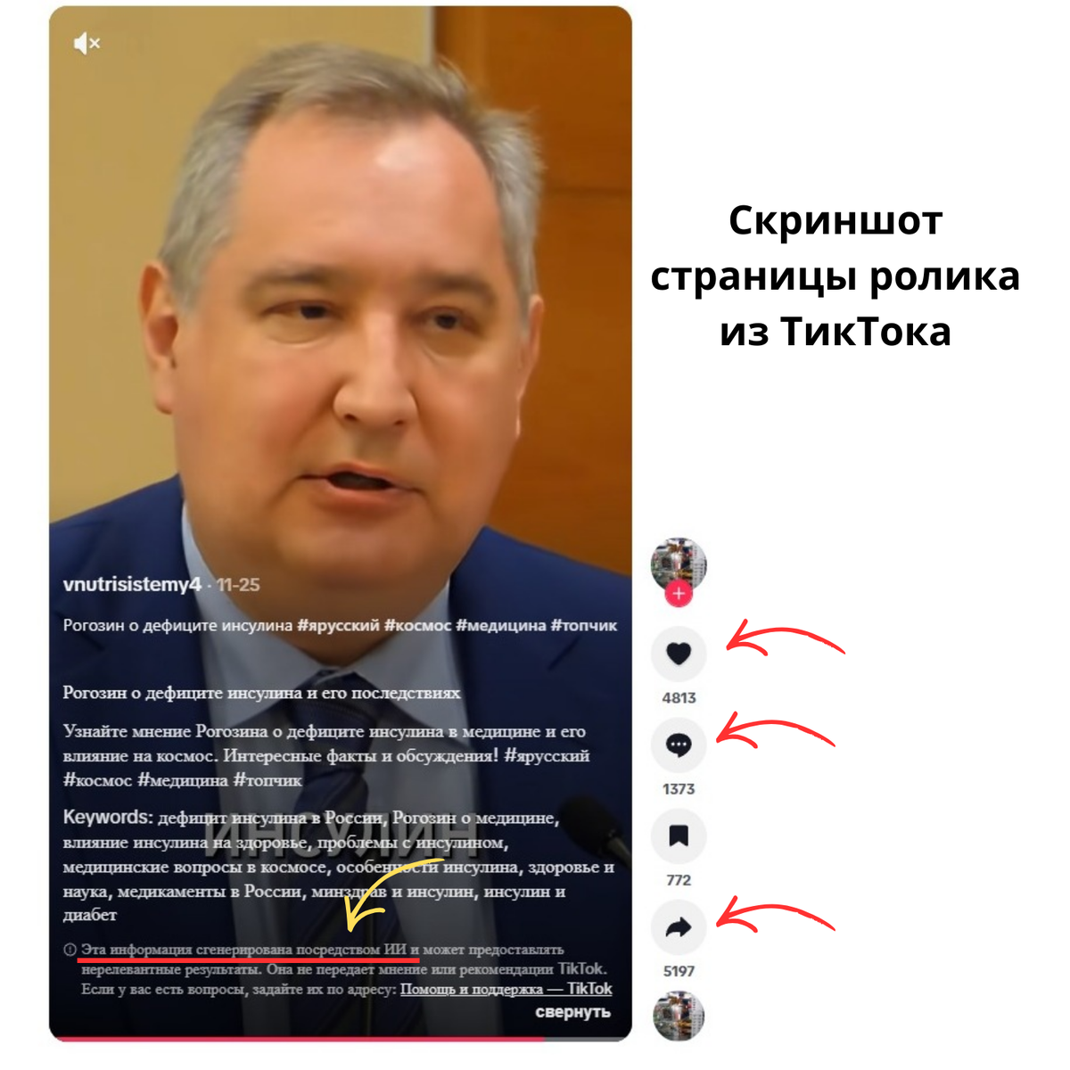 По сети разлетелось видео, где российский политик Дмитрий Рогозин будто бы произносит фразу: «Инсулин — для людей, которые вряд ли смогут помочь нашей стране». Друзья, этот ролик — классический пример того, как важно уметь отличать правду от лжи. Особенно сейчас, когда против нашей страны ведется информационная война, и нас пытаются раскачать, воздействуя в том числе на наши эмоции. Ролик прикреплен ниже Почему я поняла, что этот ролик — фейк: Отсутствие в авторитетных источниках. Этого видео нет ни в одном серьезном СМИ. А СМИ, как известно, падки на хайп — они бы мгновенно подхватили и размусолили такую тему. Первоисточник же, который я нашла, — это анонимный YouTube-аккаунт с сомнительным контентом. Неправдоподобность формулировки. Политиков учат тщательно подбирать слова и фильтровать, что можно говорить публично. Если бы Рогозин действительно позволил себе такое высказывание, это говорило бы о его полной некомпетентности на государственной должности. Нет контекста. Нигде нет инфо