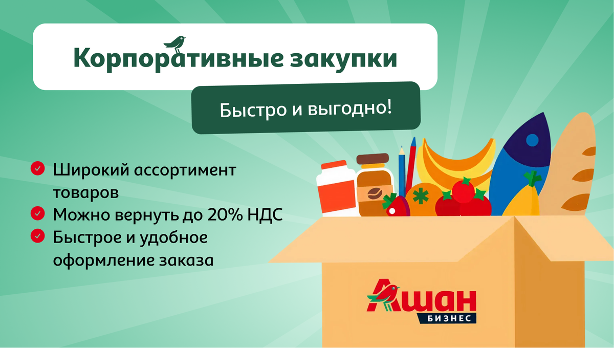 Подключайтесь к B2B-сервису «Ашан Бизнес» и покупайте продукты питания, бытовую химию, товары для офиса и HoReCa всего за 3 шага, как в обычном гипермаркете! Как начать заказывать с «Ашан Бизнес»: Войдите на сайт как обычно — по номеру телефона. В форме для регистрации укажите своё юридическое лицо: ИНН, рабочий email и контакты. Оформляйте заказы: собирайте заказы, выбирайте способ получения и оплачивайте любым удобным способом! Готово! Здесь же, в приложении, отслеживайте статусы заказов, историю покупок и чеки, выгружайте закрывающие документы в ЭДО. Почему это удобно и выгодно? Большой выбор, как в гипермаркете — от канцелярии до продуктов. Легальный возврат НДС — до 20% экономии. Оформление за 5 минут — без звонков и сложных договоров. А если возникнут вопросы, потребуется помощь в подготовке документов для отчётности или нужно будет зарезервировать заказ — персональный менеджер будет на связи! Читайте больше подробностей о сервисе «Ашан Бизнес» на сайте и забирайте промокод 1БИЗ
