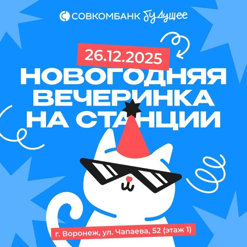 #партнерыВИВТ Новогодняя вечеринка в Воронеже! Приготовься ворваться в 2026 вместе с Совкомбанком! Стань частью Новогодней вечеринки на станции: интерактивы, розыгрыш призов и самые ламповые New Year’s Resolutions. Зарядимся амбициями, мечтами и планами, которые помогут тебе сиять ярче весь год. Встречаемся 26 декабря в 19:00 Где: Креативный кластер “Станция” Участие бесплатное, по предварительной регистрации Количество мест ограничено, 18+