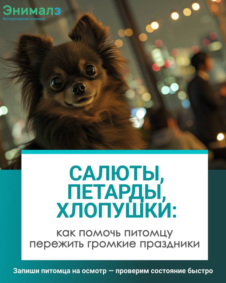 🎆 НОВОГОДНИЕ САЛЮТЫ: инструкция для владельцев 🎇 Праздники — это яркие огни, музыка и много эмоций! Но для наших питомцев громкие хлопки воспринимаются как угроза 😩 Как Вы можете помочь своему питомцу пережить этот период спокойно и безопасно? ❤️ Ниже — простая и рабочая инструкция ❤️ Сохраняй её себе ❤️ Делись с друзьями у кого есть домашний питомец 1️⃣Подготовьте безопасное место заранее Создайте небольшое укрытие, где питомцу будет комфортно: плед, домик, переноска, тёмный угол комнаты. Важно: пусть он сам выберет, где ему спокойнее. 2️⃣ Закройте окна, шторы и включите фоновые звуки Музыка, ТВ или белый шум помогут приглушить громкие хлопки. Чем меньше звуков с улицы — тем спокойнее животное. 3️⃣ Не наказывайте и не ругайте за страх! Животное не контролирует реакцию. Лучшее, что вы можете сделать — быть рядом, спокойно говорить и поддержать. 4️⃣ Не пытайтесь силой удерживать питомца Если он хочет спрятаться — позвольте. Сильные объятия могут усилить тревогу. 5️⃣ Заранее о