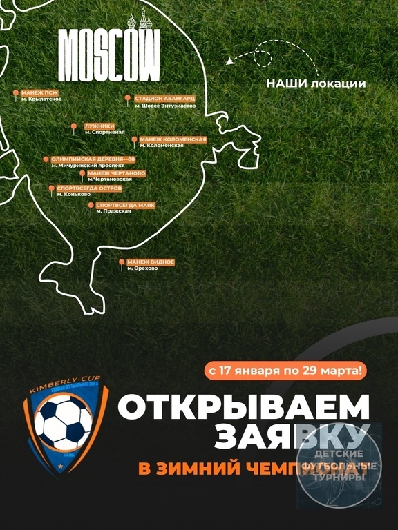 🚀Открываем заявку и приглашаем команды присоединиться к «Зимнему Чемпионату» Kimberly, который пройдет с 17 января по 29 марта! ✅Форматы: 👉🏻Лига 11х11 на улице: Дивизион 2010-2011 - 11х11(2 по 25 минут) Дивизион 2011-2012 - 11х11(2 по 25 минут) Дивизион 2012-2013 - 11х11(2 по 25 минут) Дивизион 2013-2014 - 11х11(2 по 25 минут) 👉🏻Экстра Лига на улице: Дивизион 2013 - 8+1(2 по 20 минут) Дивизион 2014 - 8+1(2 по 20 минут) Дивизион 2015 - 7+1(2 по 20 минут) Дивизион 2016 - 6+1(2 по 20 минут)(манеж+улица) Дивизион 2017 - 6+1(2 по 20 минут)(манеж+улица) 👉🏻Первая Лига на улице: Дивизион 2012/13 - 6+1(2 по 20 минут) Дивизион 2014/15 - 6+1(2 по 20 минут)(манеж+улица) 👉🏻Лига для начинающих по футбол в манеже: Дивизион 2012-2013 - 4+1(2 по 20 минут) Дивизион 2013-2014 - 4+1(2 по 20 минут) Дивизион 2014-2015 - 4+1(2 по 20 минут) Дивизион 2015-2016 - 4+1(2 по 20 минут) Дивизион 2016-2017 - 4+1(2 по 20 минут) Дивизион 2017-2018 - 4+1(2 по 20 минут) Дивизион 2018-2019 - 4+1(2 по 20 мин