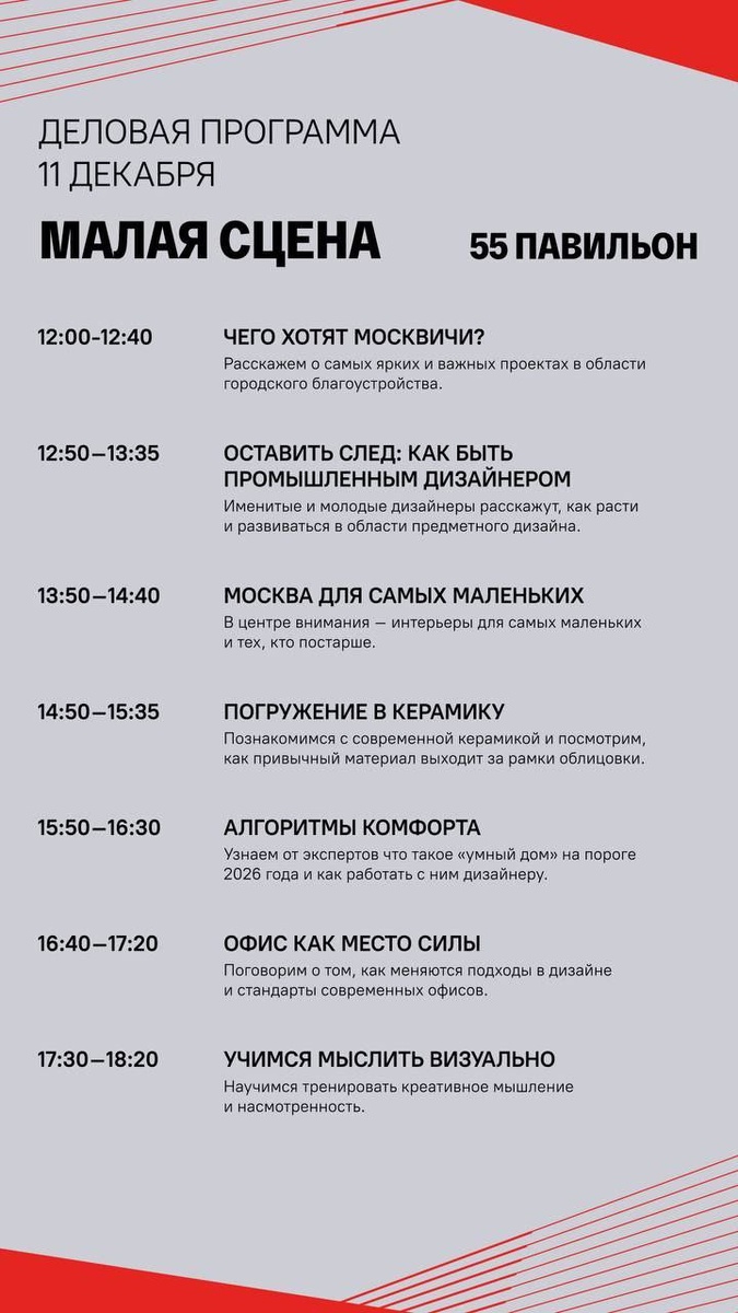 Сегодня стартует Московская неделя интерьера и дизайна С 11 по 14 декабря ВДНХ станет центром красоты и вдохновения. Павильоны 55 и 57 превратятся в пространство, где дизайн оживает во всех своих формах: от авторских предметов и инновационных материалов до неожиданных интерьерных решений, которые хочется повторить дома. Здесь можно не просто увидеть, но и прочувствовать, как создается современный российский дизайн. Гостей ждет знакомство с сотнями брендов и их создателями, насыщенная деловая программа, встречи с экспертами и возможность найти идею, которая изменит дом или подход к работе. ➡️ Вход свободный – нужна только регистрация на сайте выставки Интересный момент: Московский музей дизайна проведёт собственные экскурсии по выставке! Экскурсии помогут увидеть событие в более глубоком контексте, а также внимательно и детально рассмотреть экспозицию и отдельные экспонаты. Расписание экскурсий В зоне «Уютная квартира» в павильоне 55 доступны бесплатные консультации по дизайну и