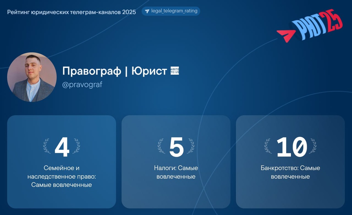 Вчера были опубликованы результаты Рейтинга юридических каналов 💌 В прошлом году я находился где-то в конце списка (40 - личные каналы, 675 - самые цитируемые, 688 - самые большие) 💌 В этом году благодаря Вам канал вошел в число самых вовлеченных в номинации семейное и наследственное право, налоги и банкротство. Полностью все номинации и место моего канала ⬇️ 📎 Личные каналы 👍 521 место Самые большие 👍210 место Индекс качества (формула РЮТ25) 👍79 место Самые вовлеченные 📎 Банкротство 👍49 место Самые большие 👍20 место Индекс качества (формула РЮТ25) 👍10 место Самые вовлеченные 📎 Банкротство для физлиц 👍50 место Самые большие 👍16 место Индекс качества (формула РЮТ25) 👍10 место Самые вовлеченные 📎 Семейное и наследственное право 👍57 место Самые большие 👍16 место Индекс качества (формула РЮТ25) 👍4 место Самые вовлеченные 📎 Налоги 👍56 место Самые большие 👍20 место Индекс качества (формула РЮТ25) 👍5 место Самые вовлеченные 📎 Проверять здесь 🤩 Честно не знаю