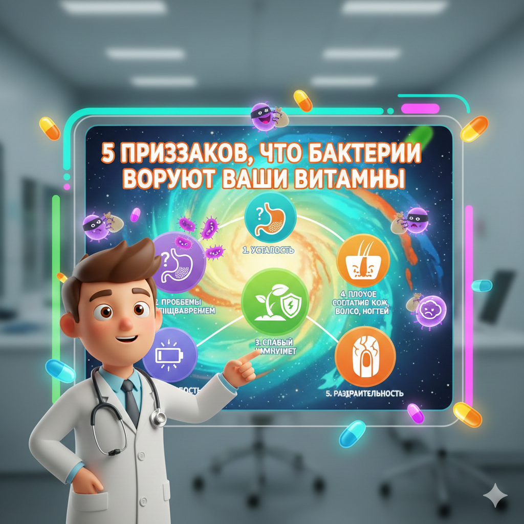 Вы пьете витамины и стараетесь питаться правильно, но чувствуете, что здоровье тает на глазах? Волосы редеют, ногти слоятся, а хроническая усталость стала вашим вечным спутником. Анализы вновь и вновь показывают дефициты, хотя вы регулярно принимаете добавки. Возможно, корень проблемы — СИБР (синдром избыточного бактериального роста). Представьте: в тонком кишечнике, где должны усваиваться питательные вещества, поселились «незваные гости» — бактерии, которые перехватывают витамины и минералы прямо у вас «из-под носа». Тревожные сигналы: 🔸 B12 остается критически низким, несмотря на прием добавок Бактерии особенно «любят» этот витамин, создавая его хронический дефицит. Это может проявляться не только усталостью, но и онемением в конечностях, проблемами с памятью. 🔸 Железо не усваивается, вызывая упрямую анемию Вы пьете добавки железа, но уровень ферритина не повышается. Бактерии не только потребляют железо, но и вызывают воспаление в кишечнике, дополнительно блокируя его усвоение. 🔸