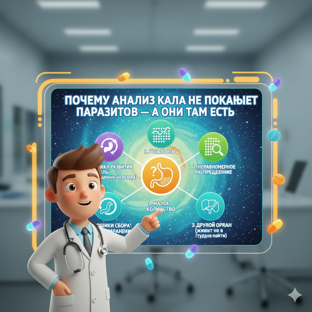 Вы сдали анализ кала на яйца глист — результат отрицательный. Врач говорит: "У вас всё чисто". Но симптомы остались: вздутие, усталость, проблемы с кожей, постоянный голод, сниженный иммунитет. анемия и тп. И вы продолжаете лечить "что-то другое". Анализ кала на яйца глист — это самый распространённый и старый метод диагностики паразитов. Его назначают по умолчанию. Его требуют для детского сада, школы, бассейна. Но вот в чём проблема: он показывает паразитов только в 10-15% случаев. Даже если они есть. Почему анализ кала не работает: 1. Паразиты откладывают яйца циклами — не каждый день Большинство паразитов откладывают яйца не постоянно, а с определённой периодичностью. Например, острицы откладывают яйца ночью в области ануса — в кале их может вообще не быть. Аскариды откладывают яйца циклами — сегодня есть, завтра нет. Вы сдали анализ в "неудачный" день — результат отрицательный. Но паразиты никуда не делись. 2. Лаборанты смотрят материал поверхностно Чтобы увидеть яйца паразитов п