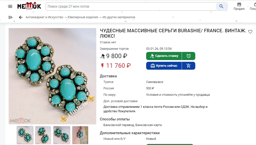 Если не винтажным серьгам придумать красочное описание, не забыв дать информацию о дорогих материалах, то серьги, приобретенные 1263 руб, можно продавать за 9800-11960 руб.