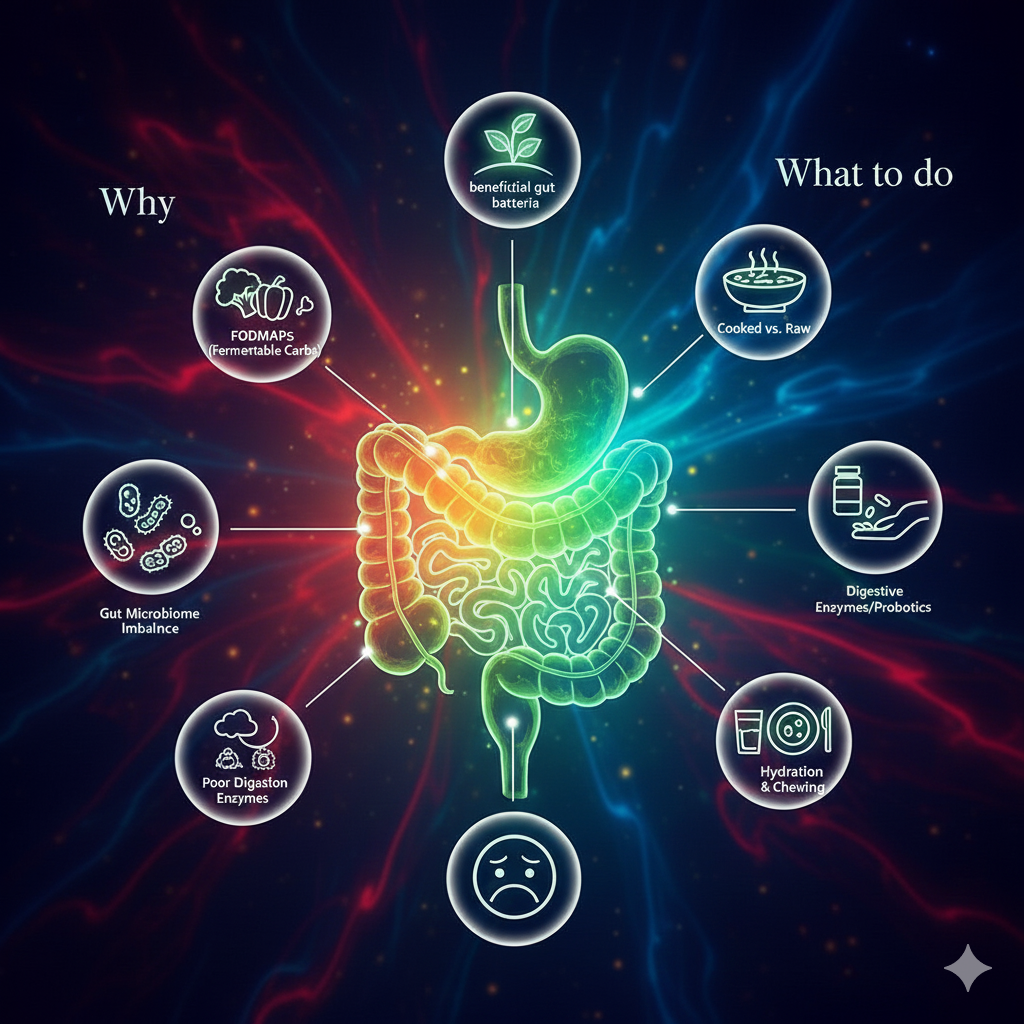 В тонком кишечнике, где еда должна усваиваться, поселились «лишние» бактерии. Когда вы едите овощи (капусту, брокколи) или фрукты, эти бактерии пируют на клетчатке и выделяют газ. Отсюда — вздутие.