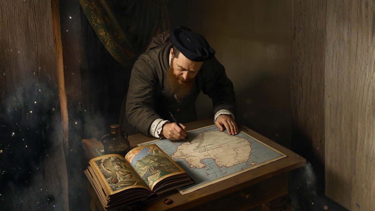 Первая улика — собственные заметки Меркатора. На полях его черновиков есть отсылки к «древним таблицам» и «морским манускриптам, восходящим ко временам Александра». Он не скрывал, что был не первооткрывателем, а топографом-кодировщиком, сводившим воедино разрозненные фрагменты знаний, чей возраст он и сам не мог оценить.