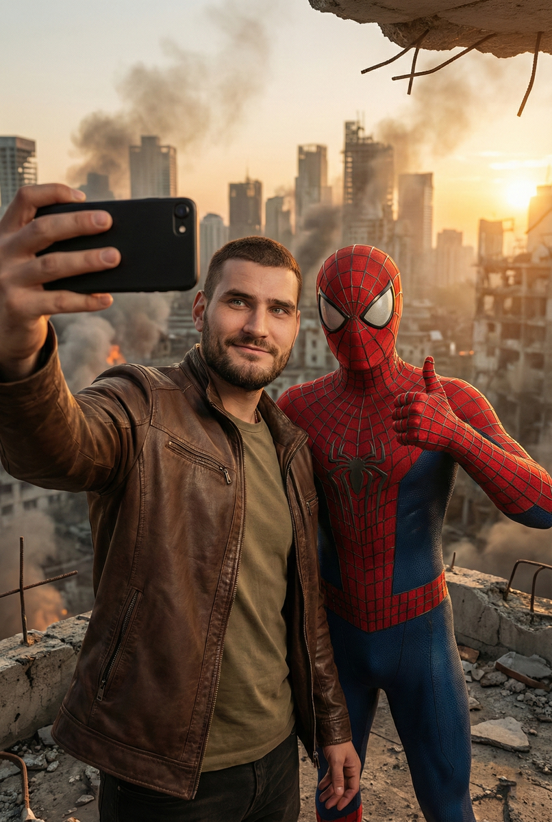 Копируем текст: **ЛИЦО И ХАРАКТЕР:** Используйте лицо человека с предоставленных фотографий. ВАЖНО: Сохраняйте 100% сходство с портретом. Все уникальные черты лица и детали должны быть точно переданы. Человек должен быть мгновенно узнаваем. СТИЛИЗАЦИЯ: Интегрируйте лицо в общий стиль изображения, адаптируя текстуру и освещение без изменения черт лица. ***Соотношение сторон: Вертикальное (соотношение сторон 2:3 или 9:16).*** **Высокодетализированное, кинематографичное, фотореалистичное изображение мужчины, делающего селфи со Человеком-пауком на ярко освещенной, разрушенной крыше с видом на постапокалиптический мегаполис на закате.** **Персонажи:** * **Мужчина:** Крепкого телосложения, высокий (190 см). На нем коричневая кожаная куртка поверх оливковой футболки, синие джинсы и белые кожаные кроссовки. У него сдержанная улыбка. * **Человек-па