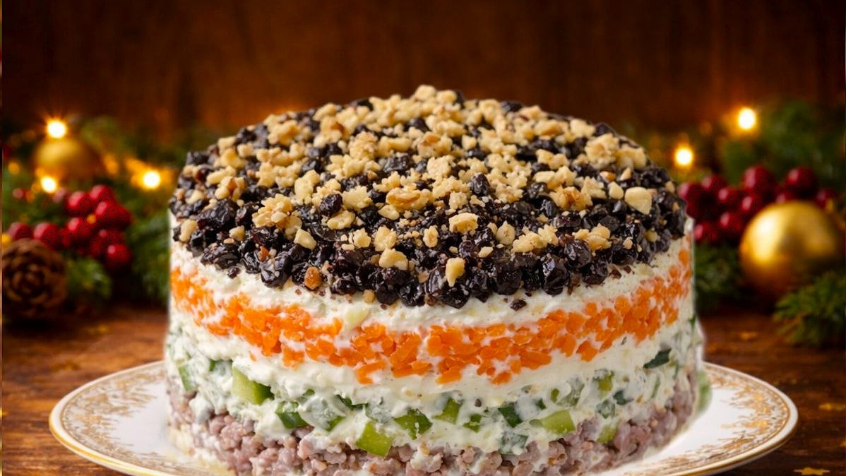 - Ингредиенты: Классический советский рецепт салата «Прага» обычно представлял собой слоеный салат и включал сочетание отварного мяса (часто говядины или курицы), маринованных огурцов, отварной моркови, чернослива и грецких орехов, заправленных майонезом. Такое сочетание вкусов (соленого, сладкого, мясного) делало его необычным и праздничным.
