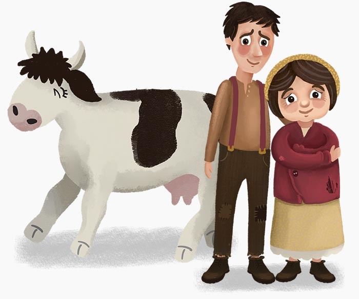 Once there was a young man named Jack. He lived with his mother on a small farm at the foot of the Foggy Mountains. Jack and his mother were very poor. Their only way of making money was selling the milk from their cow, Bess. One morning, Jack's mother woke him up early. It was still dark outside. She was crying.