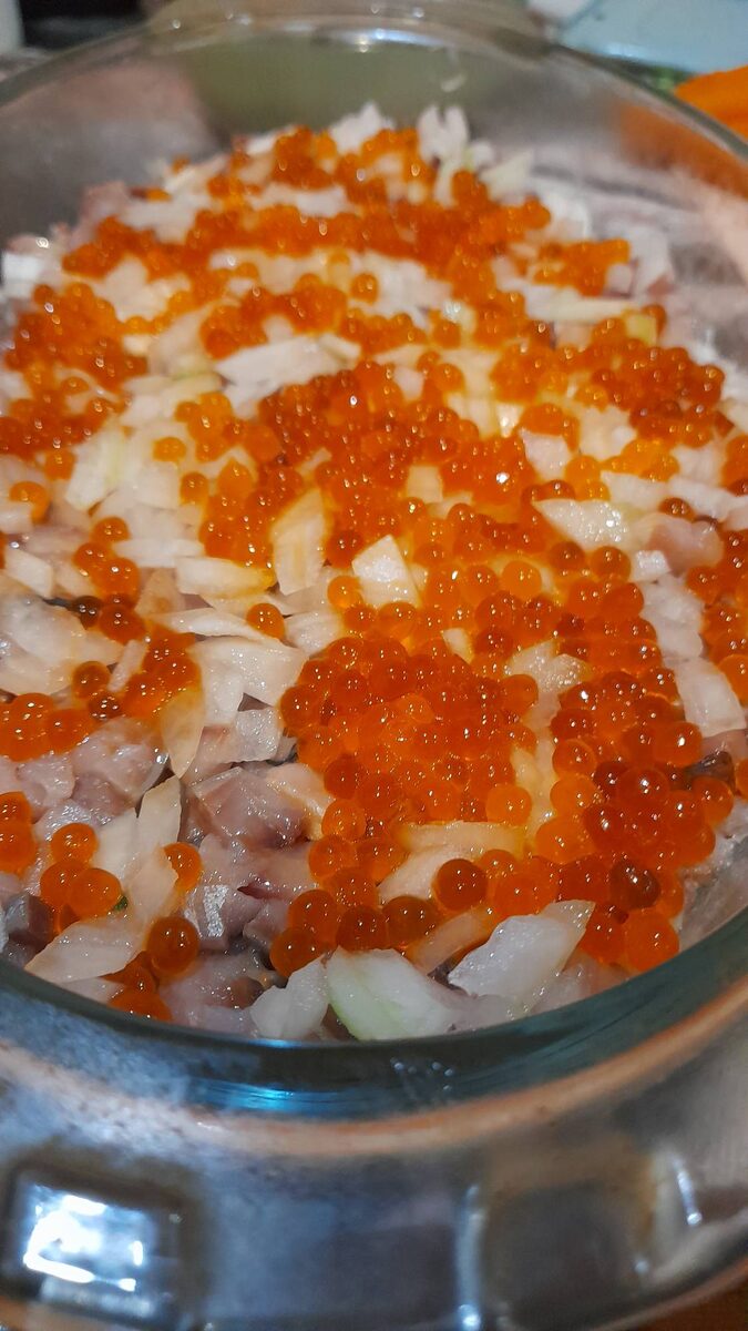 Нежный, сочный, сытный, невероятно вкусный и любимый салатик. Сегодня с небольшой «изюминкой» лопающейся на языке. Немного истории...... В 1918 году, по одному из преданий, купец Анастас Богомилов, спасая свой трактир от драк и пьяных дебошей, придумал знаменитый салат Селедка под шубой. На Новый год, повар Аристарх Прокопцев, приготовил блюдо под названием Ш.У.Б.А., что значило — Шовинизму и Упадку – Бойкот и Анафема. С этим блюдом и встречали Новый год посетители богомиловских трактиров. В народе блюдо прозвали просто: «Селедка под шубой». Это все выдумка от трактирщика до расшифровки названия. Вообще корни у сельди под шубой идут из Норвежских кулинарных книг с названием «селедочный салат» с 1851 года. В России это блюдо появилось с 1960г. и завоевало наши сердца. Многие даже не представляют Новый год без этого блюда. Внесем свежую, яркую нотку в привычное блюдо, приступим.... Ингредиенты: Сельдь целая — 2 шт.; Картофель сред. - 6 шт.; Морковь — 2 шт.; Свекла — 2 шт.; Луковица сред