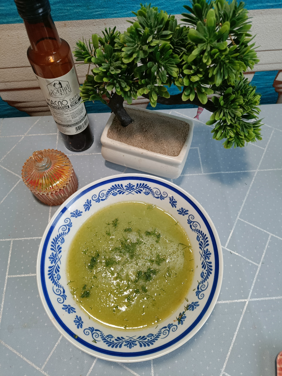 Этот суп является очень низкокалорийным и диетическим, так как основной ингредиент — кабачки, а бульон готовится на воде, и все ингредиенты для бульона (кроме воды и соли) удаляются после варки.