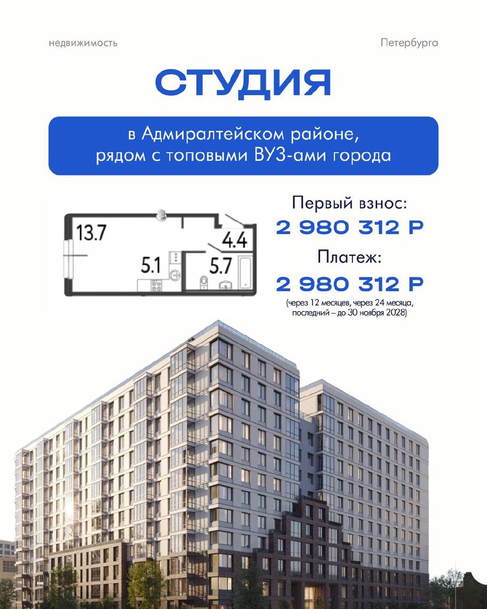 💣 РАССРОЧКА БЕЗ ЕЖЕМЕСЯЧНЫХ ПЛАТЕЖЕЙ в новом проекте у Обводного канала Планировка, первый взнос и график платежей — в карточках к посту 👆🏻 Обзор проекта мы уже делали — перейдите к нему, чтобы узнать о локации, архитектуре и концепции. Кому подойдёт этот вариант: ▪️тем, кто хочет купить квартиру для сына или дочери-студента в безопасном и комфортном районе; ▪️тем, кто не подходит под семейную ипотеку, но держит средства на вкладе и хочет выгодно вложить их в недвижимость; ▪️тем, кому важна локация рядом центр и лучшие вузы Петербурга; Если хотите рассчитать другой формат или сравнить несколько вариантов рядом с университетами — пишите Беляев.Estate, подберём лучшее решение.