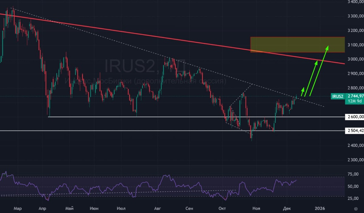 🏦 Индекс Мосбиржи 🟢 Вот и состоялся пробой наклонки. При пробое данного уровня я ожидал. что все блогеры-трейдеры будут кричать, что пробит нисходящий канал, что пора покупать, но на удивление скепсис и апатия все еще на высоком уровне, никто с покупкой не спешит. Для меня это значит, что время даже для частичного фикса еще не пришло, и я даже сегодня кое-что купил. Буду ждать дикую эйфорию в будущем, и заранее знаю, что я на ней буду делать со своими позициями. 🚗 Жду индекс выше. Ближайшие важные сопротивления: 2760, 2800-2820, 3000. #индекс #рубль #индексмосбиржи #ММВБ #IRUS #MXI #MIX #IMOEXF #bogdanoffinvest