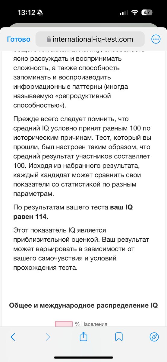 Немного не по теме Друг скинул тест на iq, который по его словам считается самым стандартным и принимается в расчет статистики. Он учится в МГУ, стало интересно самому пройти, поэтому решил с вами поделиться ссылкой, если вдруг хотите размять мозги 😄 По времени займет 20-30 мин Мой результат: 114 Ссылка : https://international-iq-test.com/ru/ Кто пройдет - напишите свои результаты в комментарии