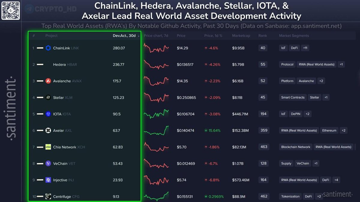 #ончейн #рейтинг 📊 Santiment: ТОП-10 RWA-проектов по активности разработчиков за последние 30 дней. 1. Chainlink #LINK 2. Hedera #HBAR 3. Avalanche #AVAX 4. Stellar #XLM 5. IOTA #IOTA 6. Axelar #AXL 7. Chia Network #XCH 8. VeChain #VET 9. Injective #INJ 10. Centrifuge #CFG Ранее: прошлый топ Crypto Headlines