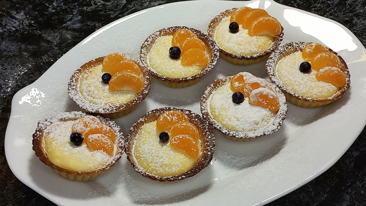 Рецепт: творог 100 гр. яйцо 1 шт. сахарная пудра 2 ст.л. сметана 1 ст.л. ванилин тарталетки песочные 7 шт. Для украшения: мандарины черника или голубика сахарная пудра Приготовление: Форму для запекания или противень застелить пергаментной бумагой. Выложить готовые тарталетки. Приготовить творожную начинку: в миску выложить творог, сметану, сахарную пудру, ванилин и яйцо. С помощью погружного блендера превратить в однородную массу. Столовой ложкой разложить начинку в тарталетки поровну. Такого количества хватает ровно на семь тарталеток Отправить в разогретую до 200 градусов духовку примерно на 20 минут. Затем вынуть из духовки и оставить до полного остывания. Переложить на сервировочную тарелку. Очистить мандаринки. Лучше брать маленькие. Украсить ими тарталетки. Затем положить по одной ягодке и посыпать сахарной пудрой Украсить можно на ваш вкус. Можно добавить для красоты листики мяты. Использовать любые ягоды. Но мандаринки и пудра обязательно, так как именно они придают де