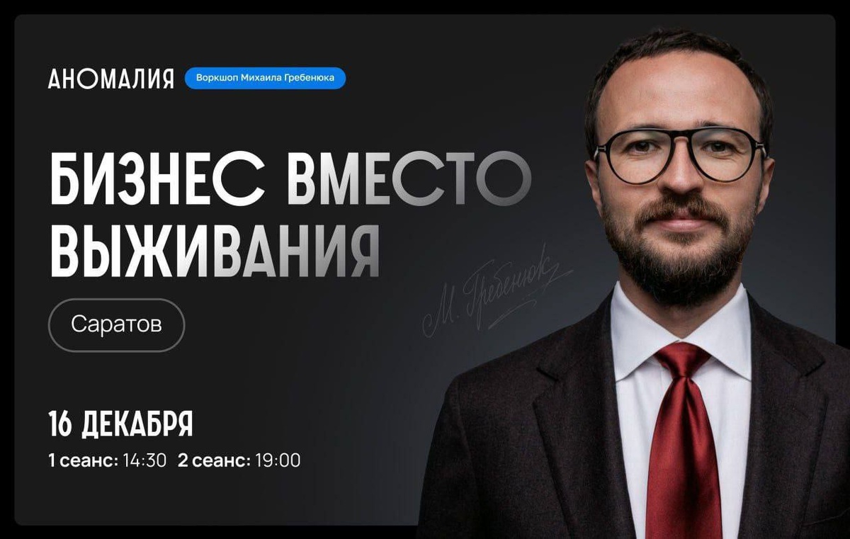 🔜Впервые по всем городам России Офлайн-воркшоп со стратегиями от Михаила Гребенюка Построим понятный план - как выжить и не сдуться в 2026: ➤ Прогоним ваш бизнес по критериям «смерти» в новом году - вы в коме или ещё подышите ➤ Построим пошаговый антикризисный план по выходу из штопора ➤ Добьём ТОП-действиями - как не просто выйти из штопора, а еще и нарастить прибыль Вас ждет закрытый показ фильма с понятными стратегиями от Михаила и отработка каждого блока на практике. Вы узнаете, как построить свою стратегию прорыва, пока остальных штормит. 🔝 Всего 2,5 часа - и вы выходите с готовым планом на 2026 год. В Саратове воркшоп 16 декабря в 14:30 и 19:00 2 сеанса по 250 человек Локация: Технопарк "Saratov Digital" В других городах дату, время и локацию можно узнать на сайте👇 https://anomalyworkshop.ru/ Переходите на сайт, регистрируйтесь и начинайте готовиться к росту в новом году