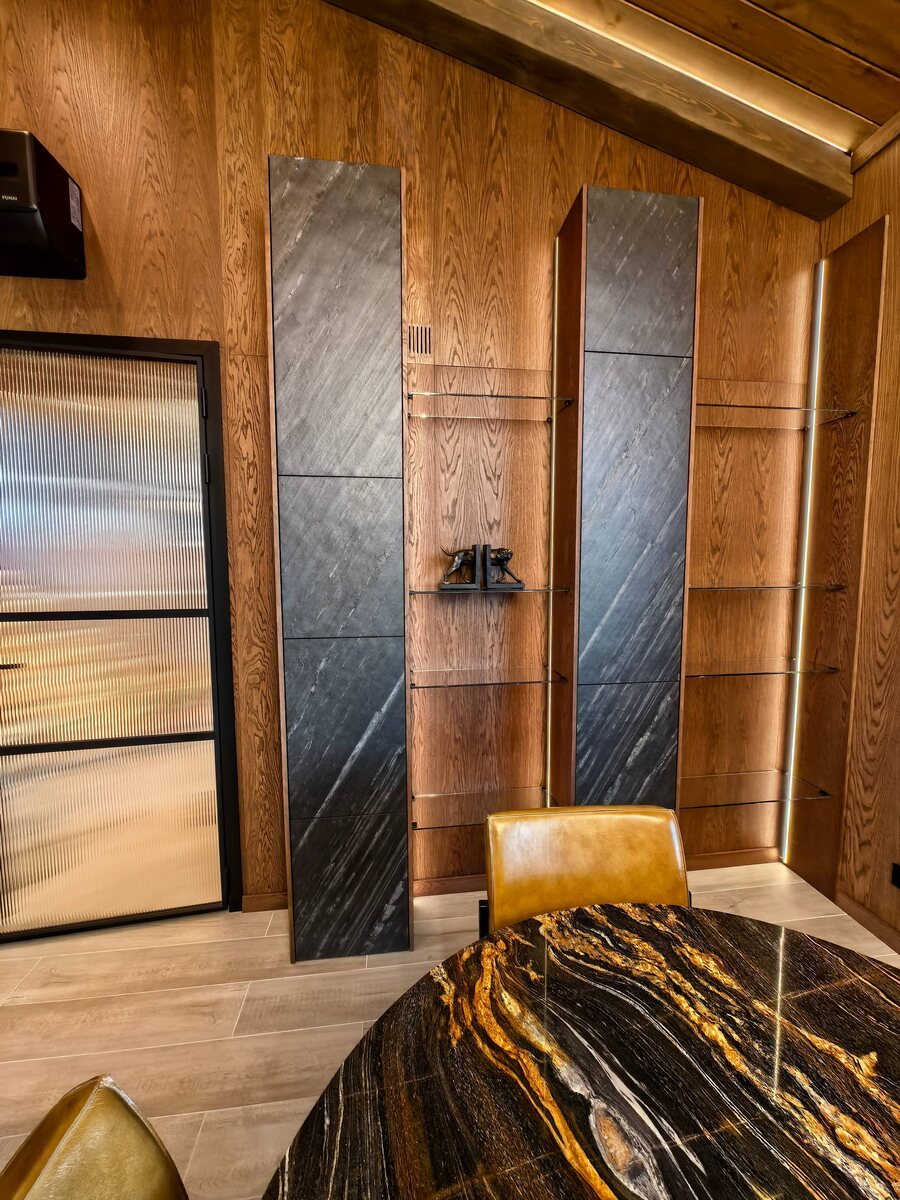В сочетании с тёплым деревом Ocean black создаёт спокойный, собранный интерьер: без лишней декоративности, но с характером. Фактура камня добавляет глубину, а диагональ рисунка подчёркивает архитектуру пространства. Материал легко монтируется, подходит для мебели и стеновых панелей, не утяжеляет конструкции и при этом выглядит как цельный камень. Весь ассортимент в наличии в Москве. Для заказа и уточнения деталей пишите @flat_stone