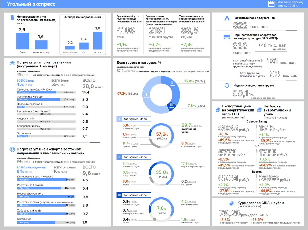 Большая часть кузбасского угля, который идёт на восток, транспортируется в инновационных вагонах. При этом железнодорожники сообщают о недопогрузке. По итогам ноября из Кузбасса отгружено 14,4 млн тонн угля. 86% твёрдого топлива, которое Кузбасс поставляет на восток, перевозится "с комфортом" в инновационных вагонах, сообщает официальный тг-канал РЖД. – Более половины, 55%, всего угля погружено в восточном направлении. В инновационных вагонах в экспортном сообщении на восток следовало 84% угля (из Кузбасса – 86%), – сказали в РЖД. По всей России железнодорожники отгрузили за ноябрь 28 млн тонн. При этом компания озвучила неожиданную сложность, выявленную Институтом экономики и развития транспорта (ИЭРТ): всего за месяц не было предъявлено 2,9 млн тонн, в том числе на экспорт – 1,6 млн тонн, из них в восточном направлении – 1 млн тонн. – Это именно тот объём, который РЖД готовы были перевезти и зарезервировали под это свои мощности в ущерб отправке других грузов, – подчеркнули в компани