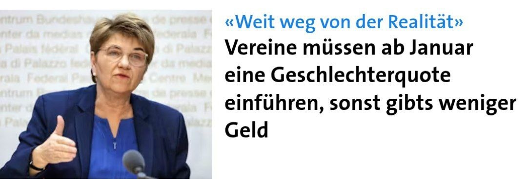 С 1 января 2026 года местные спортивные клубы Швейцарии должны будут соблюдать более строгие требования, чтобы получать федеральные субсидии по программе Jugend+Sport (J+S). В их уставах необходимо будет прописать ограничение срока полномочий членов правления и гендерную квоту. Поводом для реформы стала инициированная бывшей федеральной советницей Виолой Амхерд корректировка Постановления о поддержке спорта — реакция на нарушения, ставшие известными благодаря делу «Протоколы Магглингена». Для национальных федераций эти правила действуют уже с начала 2025 года: в правлении должны быть представлены как минимум 40% женщин и 40% мужчин. Однако, как показал анализ газеты Neue Zürcher Zeitung в октябре, более половины спортивных федераций не достигли требуемой доли женщин. «Далеко от реальности в клубах» Региональные клубы тоже сталкиваются с трудностями. Swiss Olympic рекомендует 40-процентную долю женщин, но обязательным является только то, что каждый клуб должен установить свою собств