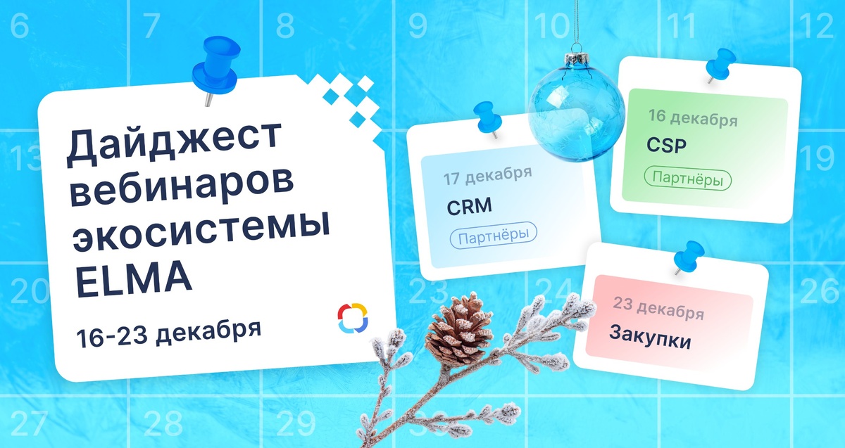 📆 БЛИЖАЙШИЕ ВЕБИНАРЫ ➡️ 16 декабря 11:00 Вебинар «От документооборота к экосистеме: путь DODO Brands на ELMA365» Ведущие: Александра Лощёнова, Артем Камышев, Алексей Медведовский Подробнее ➡️ 17 декабря 11:00 Вебинар «От кладбища данных к живым продажам» Ведущие: Наталья Самойлова, Алексей Трефилов, Ольга Мамкина, Вахид Алиев Подробнее ➡️ 23 декабря 11:00 Вебинар «Портал поставщика ELMA365: больше чем ЭТП» Ведущий: Андрей Брындин Подробнее До встречи на вебинарах! 👍
