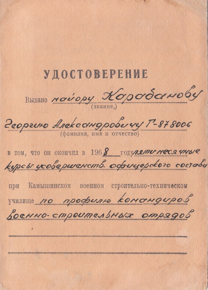 Удостоверение выданное майору Карабанову Г.А. в том, что он в 1968 году окончил пятимесячные курсы усовершенствования офицерского состава при Камышинском военном строительно-техническом училище по профилю командиров военно-строительных отрядов. Источник: отсканированное удостоверение из личной коллекции. #документ #удостоверение #ВСО #майор #Советская_армия