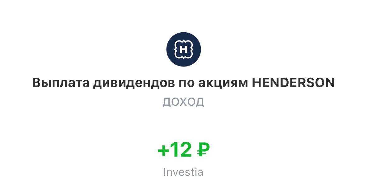 ⚡️ Дивиденды HEDERSON 📊 Получены дивиденды в размере 11 рублей после вычета налога. Держу всего 1 акцию, в портфеле доля 0,2%. 🔔 Учитывая что пополнения счёта скорее всего прекратятся, даже это радует. 🖱 Investia - читай и смотри где удобно!
