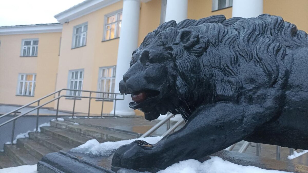 Чугунный лев на площади Ленина в Петрозаводске перешел на орехи. Видимо в батин новогодний костюм даже влезть не смог.