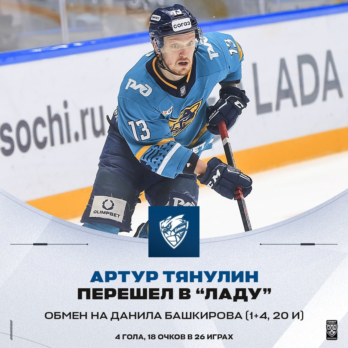 В «Ладу» переходит второй бомбардир ХК «Сочи» Артур Тянулин 🚙