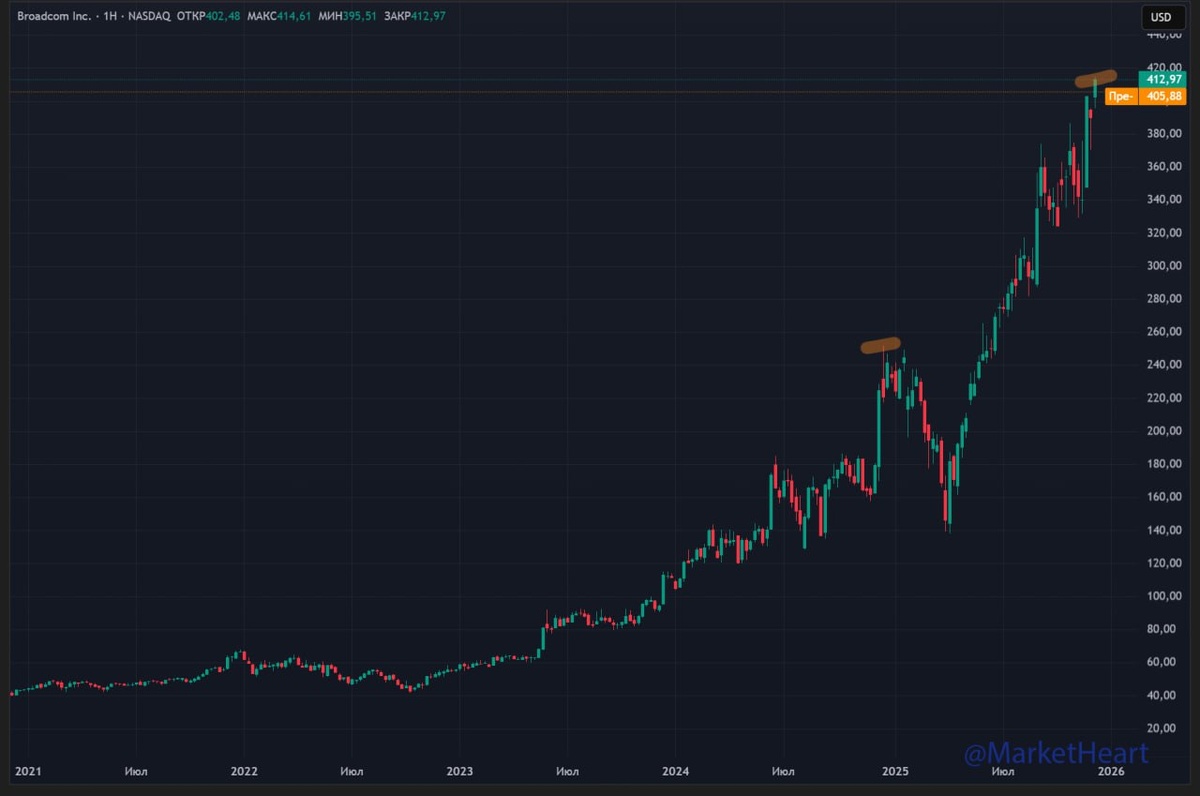 В ответ на пост К слову Oracle сейчас минусует уже на 11% на премаркете, но это, видимо, только начало Обратите внимание: Broadcom [шестая бумажка по капе в мире!] сегодня будет также отчитываться после торгового дня Акция сделала +200% с момента апрельского лоя. Что может пойти не так для ИИ-порно-пузыря? @marketheart