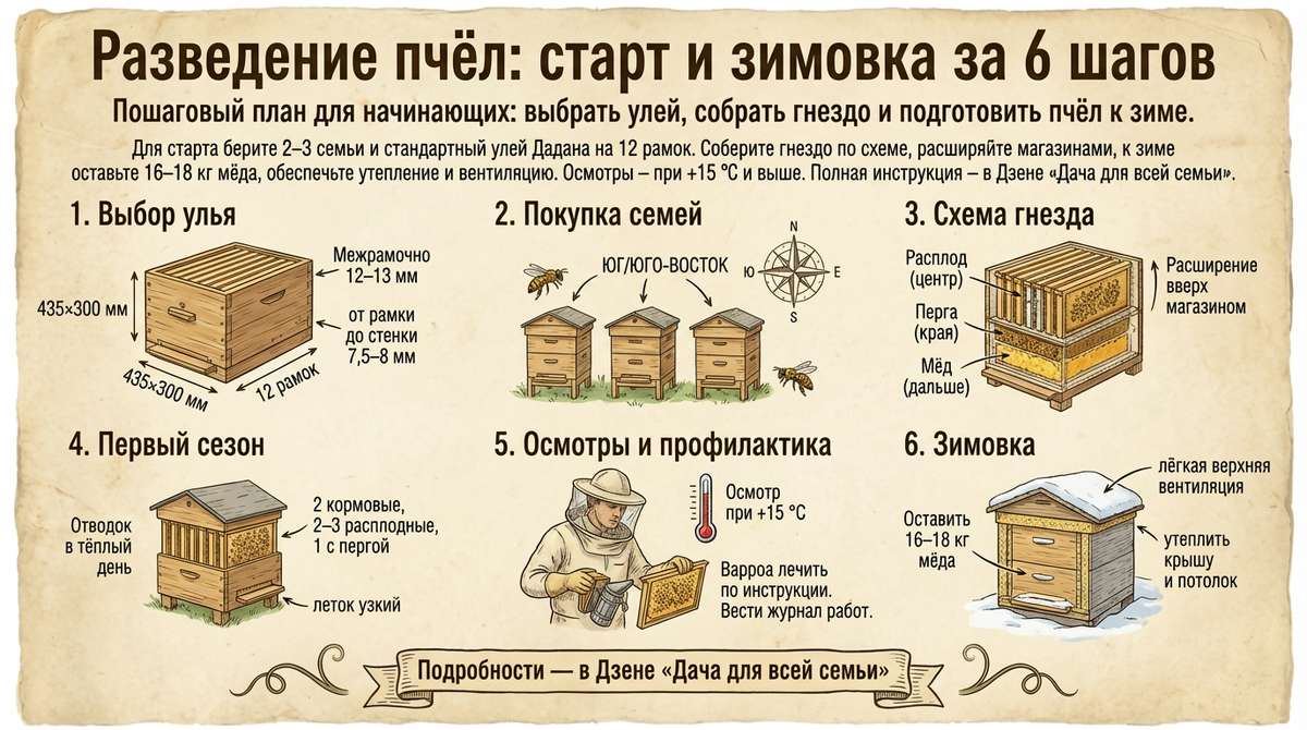 Для разведения пчел я считаю удачным стартом 2–3 семьи в однокорпусных дадановских ульях на 12 рамок 435×300 мм. Эта схема улья понятна, детали доступны, а наращивать силу просто магазинными надставками. На зиму оставляйте 16–18 кг мёда, делайте утепление и лёгкую вентиляцию — так пчёлы зимой сидят спокойно и не сыреют. Осмотры проводите в солнечную безветренную погоду при температуре не ниже +15 °C — это базовый ритм для начинающих.