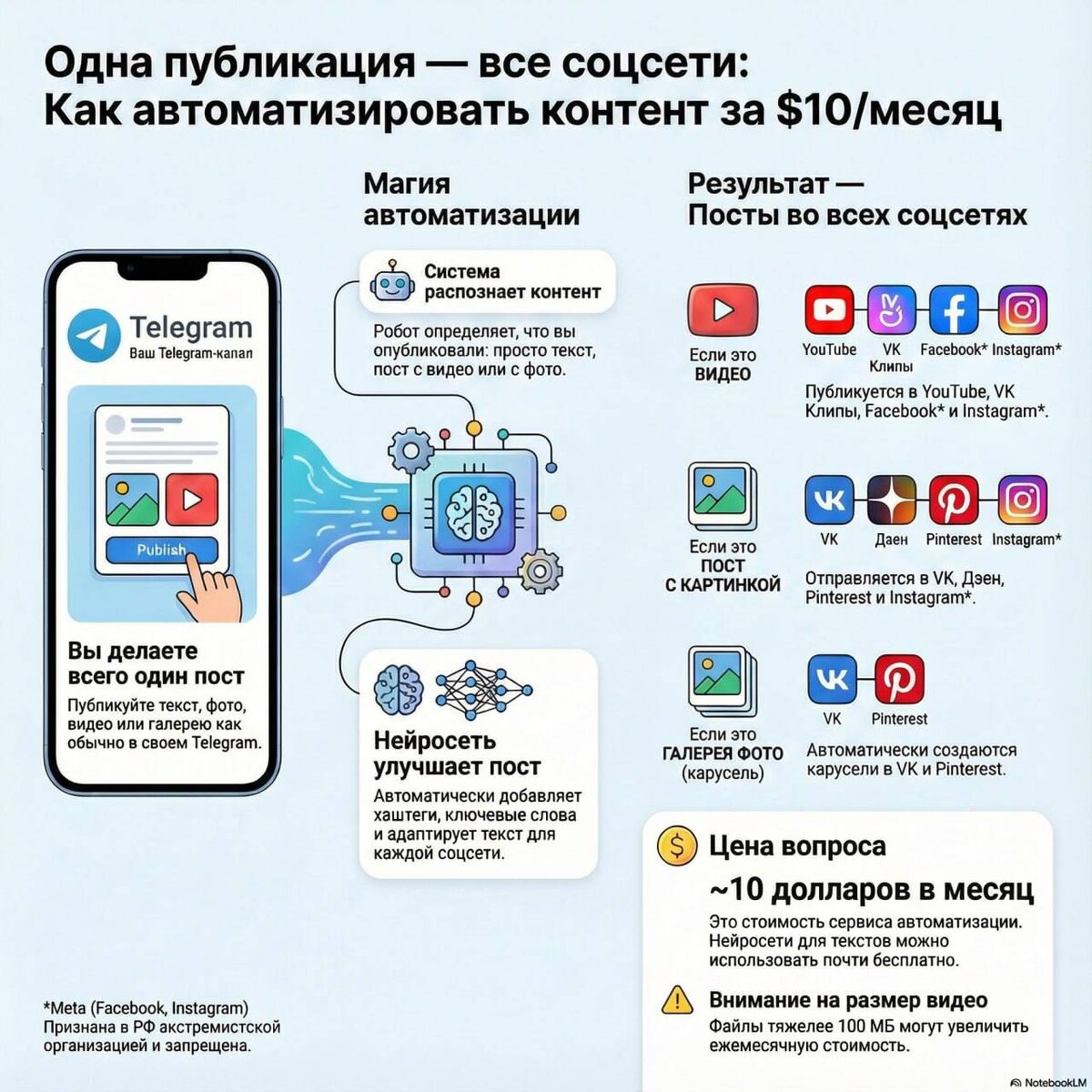Хватит выгорать! Нейросеть сделает кросспостинг за вас за 10$! Устали от рутины? Кросспостинг в социальных сетях отнимает всё время? Забудьте про выгорание! Я нашел способ, который изменит вашу работу с контентом. Ваш личный ассистент 24/7 Теперь вам нужен только Telegram-канал. Публикуйте посты, а умная система с нейросетью возьмет все на себя. Она адаптирует ваш контент для ВК, Дзен, Instagram, YouTube. Это не просто сервисы кросспостинга, это полноценный ассистент, который добавляет заголовки, хэштеги, описания. Он работает 24/7, не устает и не ошибается. Стоимость - всего $10 в месяц. Хотите узнать, как настроить кросспостинг под себя? Пишите, и я сделаю индивидуальное предложение!