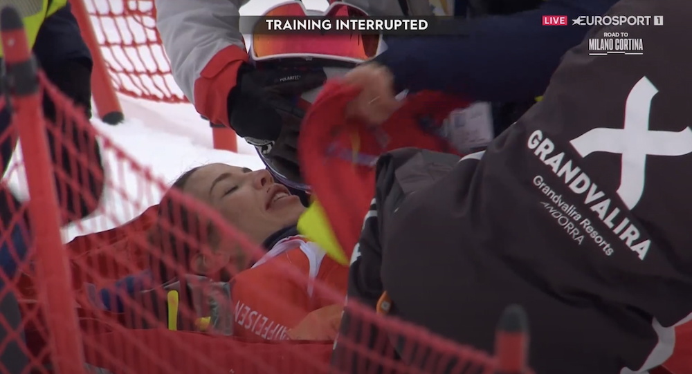 К сожалению, еще до официального открытия скоростного сезона женского Кубка мира тренировка в Санкт-Морице завершилась тяжелым падением Мишель Гизин. Швейцарская горнолыжница не удержалась на лыжах в вираже на нижней части трассы и на высокой скорости улетела в сетки, пробив первую сетку безопасности и остановившись у второй. Швейцарка не смогла сама покинуть трассу, ее транспортировали вниз к вертолету. Судя по характеру падения, у Мишель – тяжелая травма. Тренировка была немедленно остановлена. Линдси Вонн стартовала после Мишель, и ее остановили после того, как она успела проехать первую треть дистанции. Вчера Вонн показала лучшее время на первой тренировке скоростного спуска. Горнолыжное сообщество обеспокоено судьбой Мишель Гизин, пока информации о ее состоянии нет. Ранее в начале сезона две сильнейших горнолыжницы мира получили травмы – у Лары Гут-Бехрами разрыв крестообразной связки колена, у Коринн Сутер – разрыв мышечного волокна в левой голени и разнообразные менее тяжелые