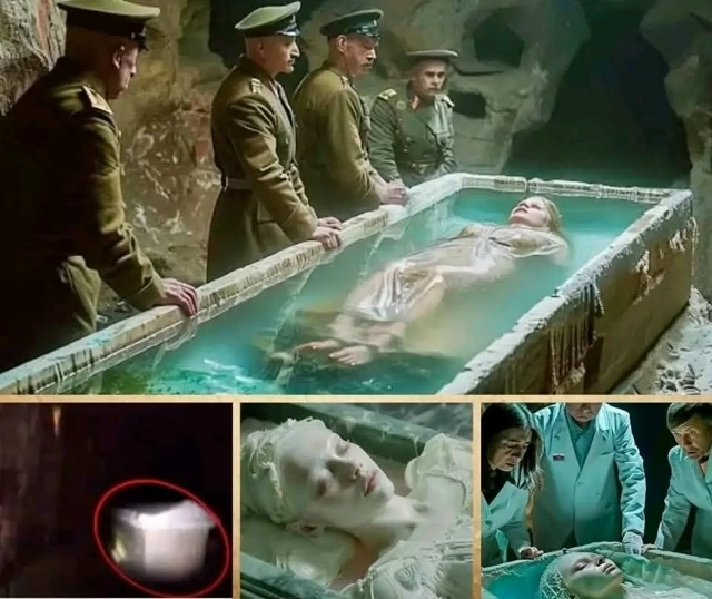 Дальше и вовсе начались чудеса. Когда крышка саркофага была снята, все увидели, что он до самого верха заполнен прозрачной розово-голубоватой жидкостью, в которую была погружена необыкновенной красоты женщина лет тридцати, с правильными европейскими чертами лица, шикарными слегка вьющимися волосами и широко раскрытыми голубыми глазами. Её рост составлял около 180 сантиметров. Одета она была в светлое полупрозрачное платье с тончайшим цветочным узором. Женщина выглядела, как живая. У её изголовья лежал небольшого размера предмет, неизвестного предназначения.
