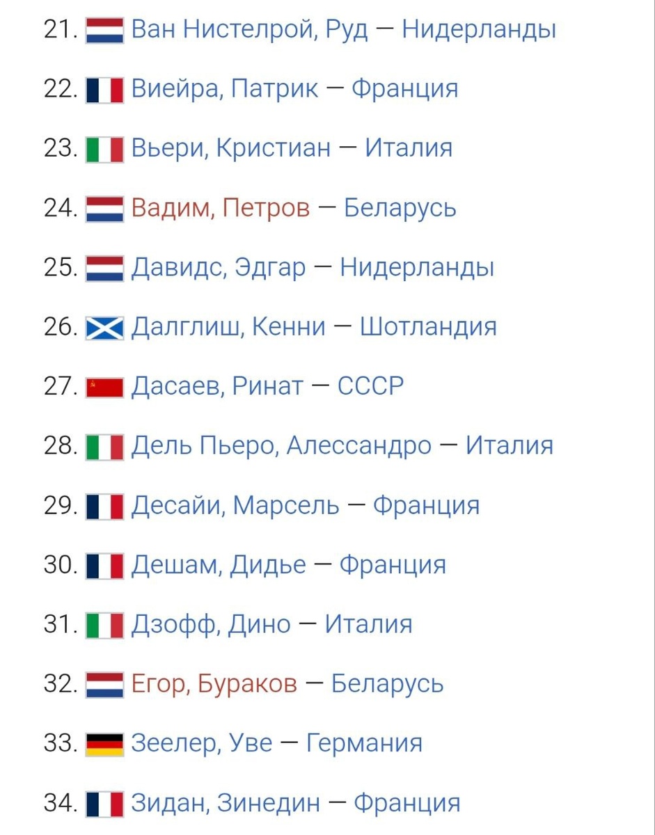 Не так давно я решил пробежаться по списку ФИФА 100, чтобы вспомнить что за игроки были включены в список величайших по версии Пеле. В 2004 году ФИФА предложила Королю выбрать 100 лучших игроков – по 50 из действующих и уже завершивших карьеру. Трехкратный чемпион мира немного не вписался и список раздулся до 125 человек. Но он Король, ему было можно. Так вот, залез я на Википедию и вижу там такое: "Вадим Петров – Беларусь", "Егор Бураков – Беларусь"! Чтобы вы понимали, дело было за 3 часа ночи и я не мог заснуть (кто-то в такой ситуации считает овец, а я – игроков) поэтому мой уставший мозг секунд 10 переваривал эту информацию. Понятно, что кто-то решил пранкануть, но уже внесли бы туда хотя бы настоящих футболистов, а не выдуманных. Но на тот момент пострадали Рууд Гуллит и Кларенс Зеедорф. Один за то, исповедовал сексуальный футбол в "Тереке", второй – за то, что поиграл и за "Интер", и за "Милан". Или кто-то просто не любит дреды. По крайней мере так я себе описываю логику исклю