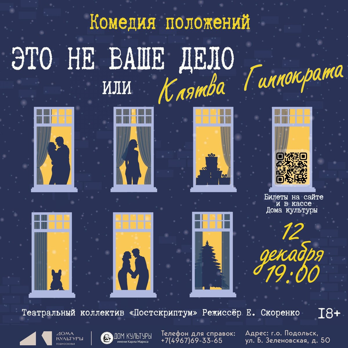 ✨ Премьера спектакля «Это не ваше дело, или «Клятва Гиппократа»! 🎭Театральный коллектив «Постскриптум» представляет комедию о докторе Дэвиде Мортимере, который накануне Рождества готовится к выступлению на важнейшей конференции. 🎯В итоге: отношения с коллегами, непростые семейные связи и даже столкновение с полицией. Чем же закончится этот злополучный день? ⏳ Продолжительность 2.5 часа с антрактом 🚫 Возраст: 18+ 📆 12.12.2025 🕒 19:00 🏢 ДК им. Карла Маркса 📍 г. Подольск, ул. Большая Зелёновская, 50 💰 Цена: 500 ₽ 🎫 Купить билет: https://clck.ru/3QPH4K ⭐Поддержать канал голосом 🍰Где поесть в Подольске ✅ Мероприятия Подольск https://dzen.ru/id/66ed500f7b5671493eca3fd6 http://vk.com/podolsk_events http://dzen.ru/podolsk_events