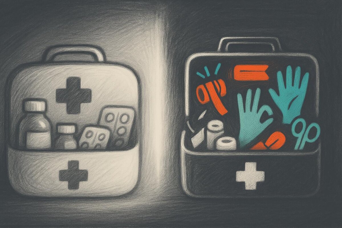 Очень частая ошибка: думать, что это одно и то же Но это два абсолютно разных набора, с разными задачами и разными сценариями применения. ➕ Домашняя аптечка Это ваши личные лекарства/витамины/добавки и тп: — от головы — от живота — от давления — то, что назначил врач — то, что принимаете курсами Она нужна для привычных, бытовых историй ➕ Аптечка первой помощи Это совсем другой набор и совсем другая философия. Тут вещи, которые работают, когда счёт идёт на минуты: — турникет для остановки сильного кровотечения — перевязочные и компрессионные бандажи — средства для проникающих ранений грудной клетки — нитриловые перчатки → Словом ИНСТРУМЕНТЫ, которые позволяют дожить до приезда медиков Это не про «облегчить» Это про «спасти» Как же должно быть в идеальном нормальном мире? ✔ Домашняя аптечка → где-то дома в шкафу, на полке, в ящике ✔ Аптечка первой помощи → всегда на виду, всегда с собой и в быстром доступе ✔ И главное: ты умеешь всем этим пользоваться Как пользоваться содержимым аптечки