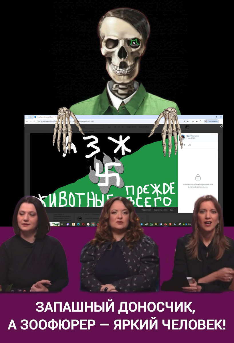 Три иноагентки вечерком Трепались дружно за столом. Про то, что тигров дрессировщик — Нелицеприятный им доносчик! Мол, негодяй этот Запашный, Да и вообще стукач он страшный! Посмел на Юрку «нетвойниста», Ярчайшего «зоозатейниста», Поклёп публичный совершить — Чем неудобство причинить! А зоофюрер — молодец! Он настоящий наш борец! Придумал, как в России можно Защитой прав животных ложной Власть нашу осторожно, Сместить по опыту краины! Чтобы в России правил тот, Кто для зверей на всё готов! Кто человеков за людей Не принимал, держа за скот! … Все три дивчины иноагентских В бегах сейчас антироссийских Одна бежит быстрей другой В России ждёт всех трёх конвой! Юлия Леонидовна Таратута — гражданка РФ, уроженка Украины, 47 лет, ведущая телеканала «Дождь», иноагент, находится в розыске. Анна Викторовна Монгайт — гражданка РФ, уроженка Украины, 47 лет, ведущая телеканала «Дождь», иноагент, находится в розыске (заочно осуждена и включена в перечень террористов и экстремистов Росфинмониторинг