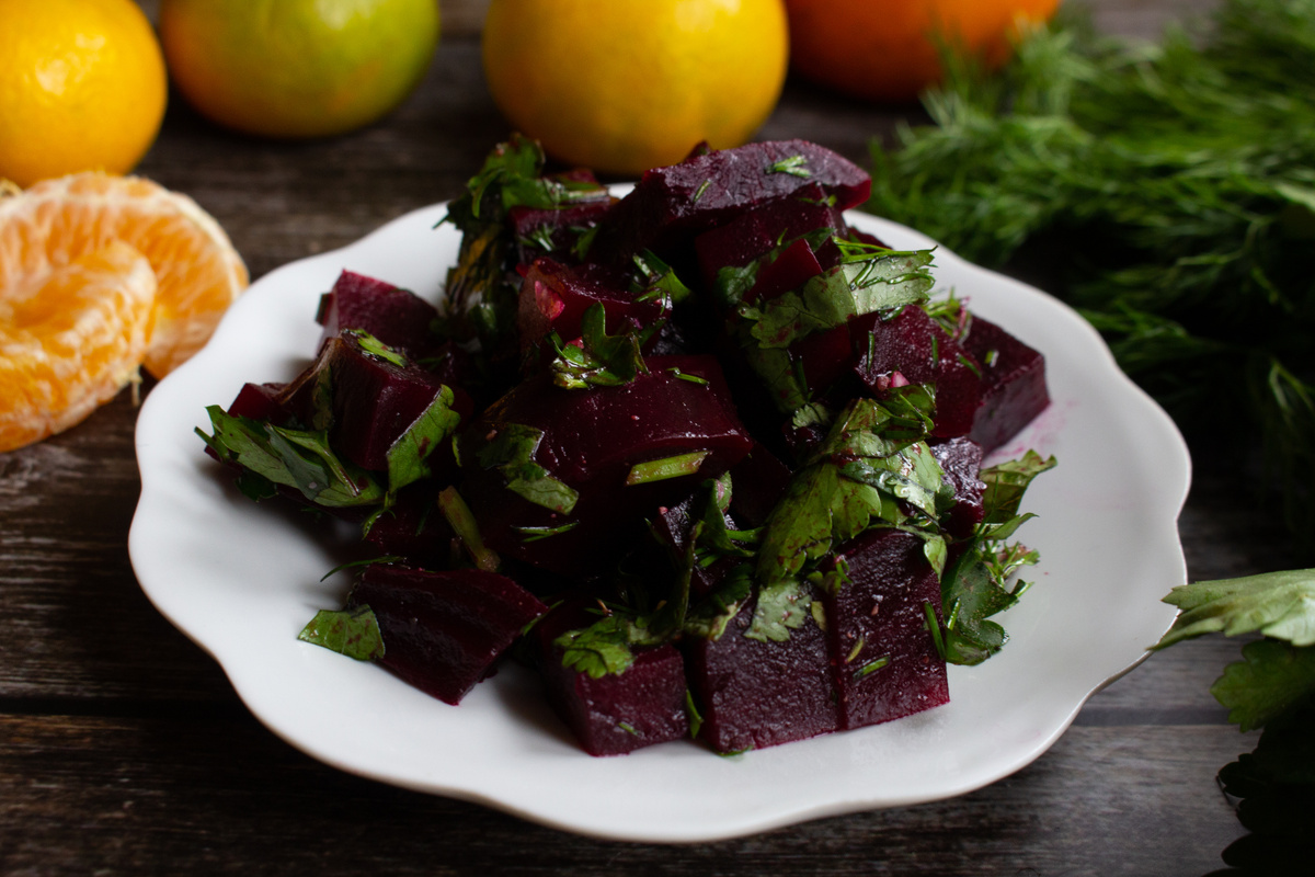 Простой и полезный салат, который порадует любителей вареной свеклы. Такой салат готовить просто и быстро, если свеклу приготовить заранее. Свеклу можно сварить, а можно запечь. Этот салат получается яркий, легкий, ароматный и вкусный. Свекольный салат отлично подойдет для разгрузочный дней, для постного или веганского меню. Зелень для приготовления можно использовать любую, но кинза добавляет аромат, который сложно заменить. Количество зелени, чеснока добавляем по своему вкусу. Вместо мандаринов, можно взять апельсин. Ингредиенты: Свекла вареная - 2 шт. Укроп - 3-4 веточки Кинза - 7-8 веточек Перец черный молотый - щепотка Соль - по вкусу Заправка: Сок мандариновый - 4 ст.л. Уксус винный красный - 0.5 ст.л. Масло оливковое - 1 ст.л. Чеснок - 1 зуб. Свеклу сварим или запекаем до мягкости, остудим и почистим. Выжмем сок из мандаринов. Добавим в посуду с соком оливковое масло. Добавим в заправку винный уксус. Продавим через пресс чеснок в заправку и перемешиваем. Свеклу нарежем ку